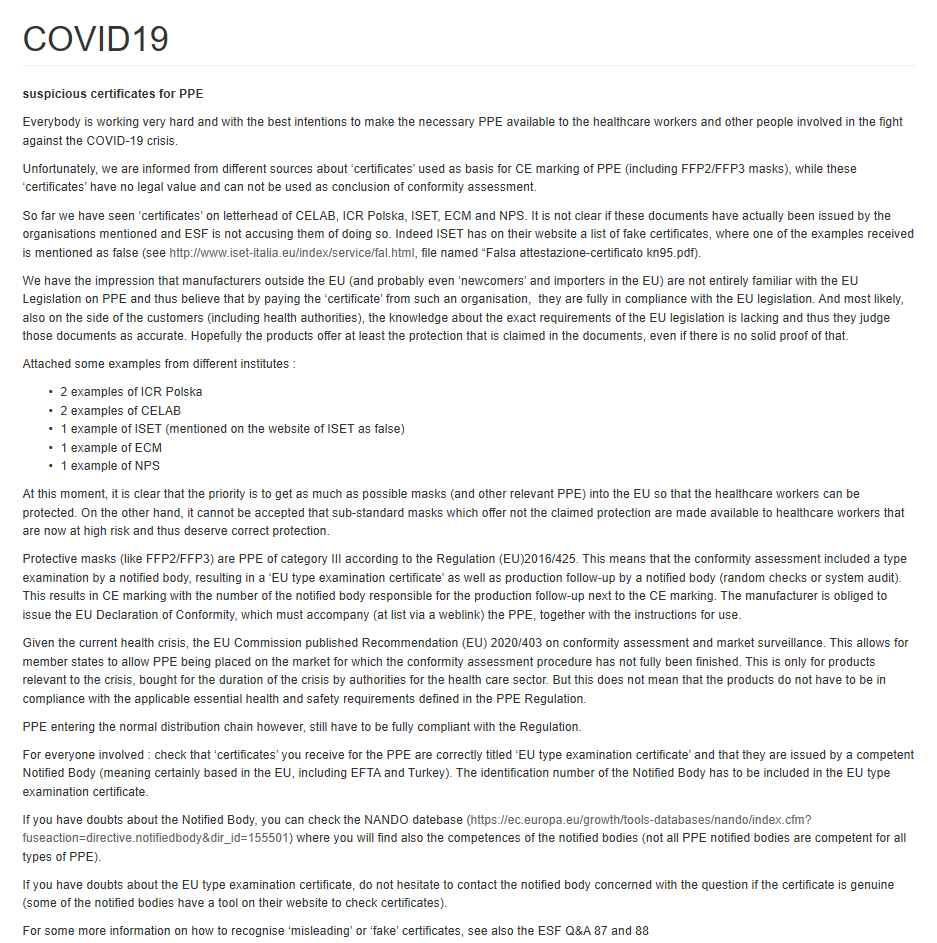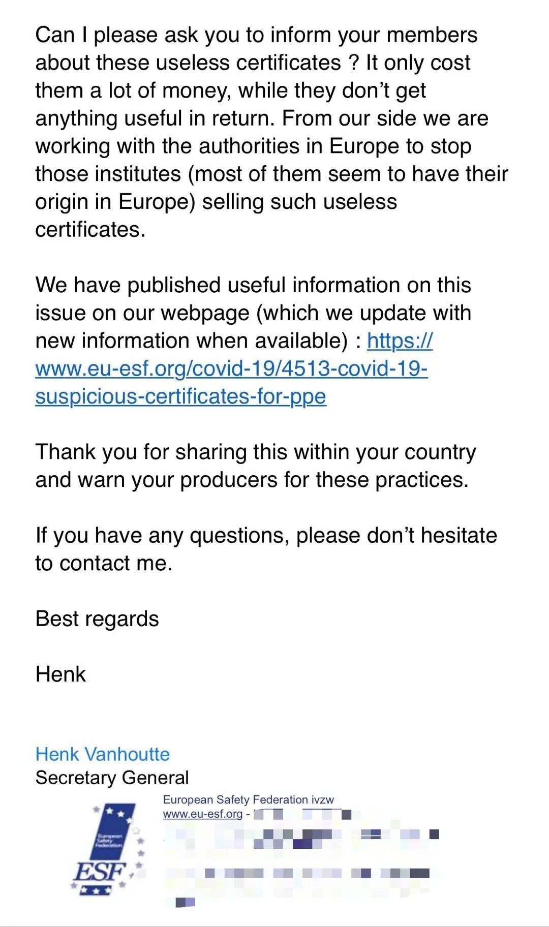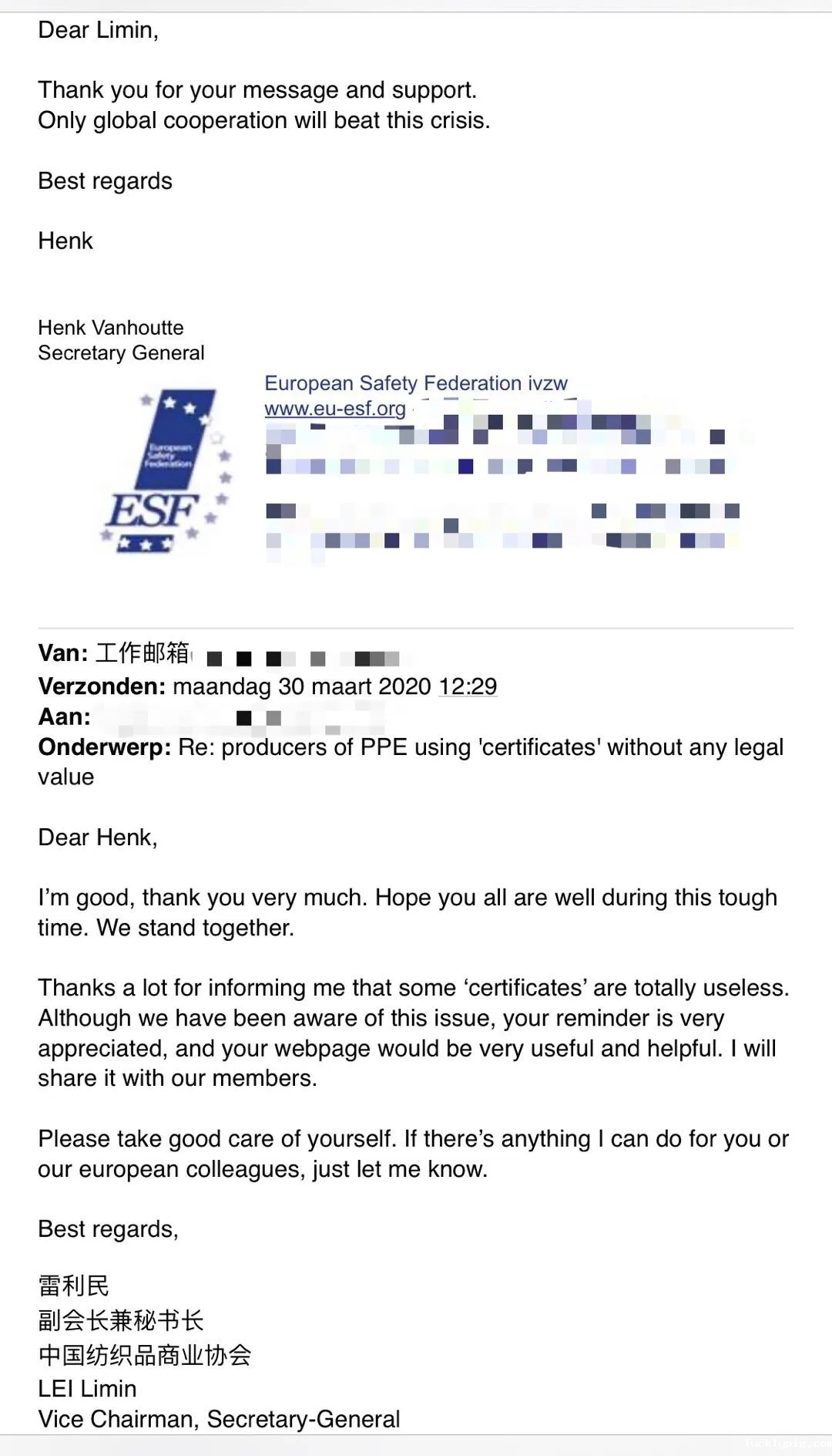 3月30日,欧洲安全联盟(European Safety Federation )秘书长汉克·范霍特(Henk Vanhoutte)先生给云博在线官网首页副会长兼秘书长、安全健康防护用品委员会会长雷利民先生发来邮件,介绍欧洲地区对进口防护口罩进行检查的实际情况。表示不少中国公司对欧盟地区的相关法规不很熟悉,很多口罩等个体防护用品(PPE)使用了无效甚至虚假的CE证书,花了冤枉钱,完全得不到相关法规的保护。